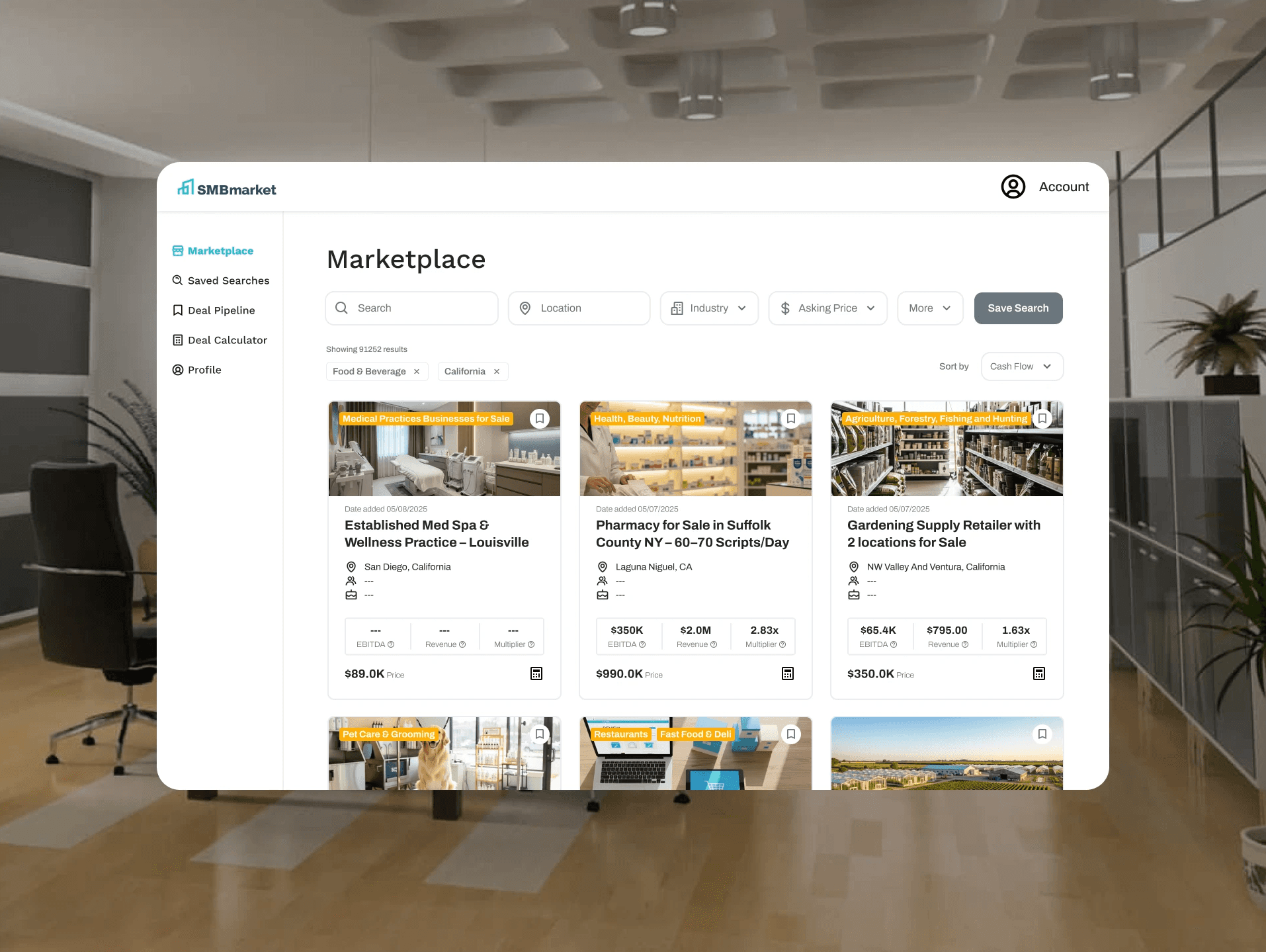 SMBmarket tasked my team with redesigning the marketplace experience. I introduced AI-generated listing images to help sellers without professional photos stand out among 85,000+ listings, while redesigning the buyer-facing marketplace with visual filters and cognitive science-backed card layouts to guide first-time buyers.